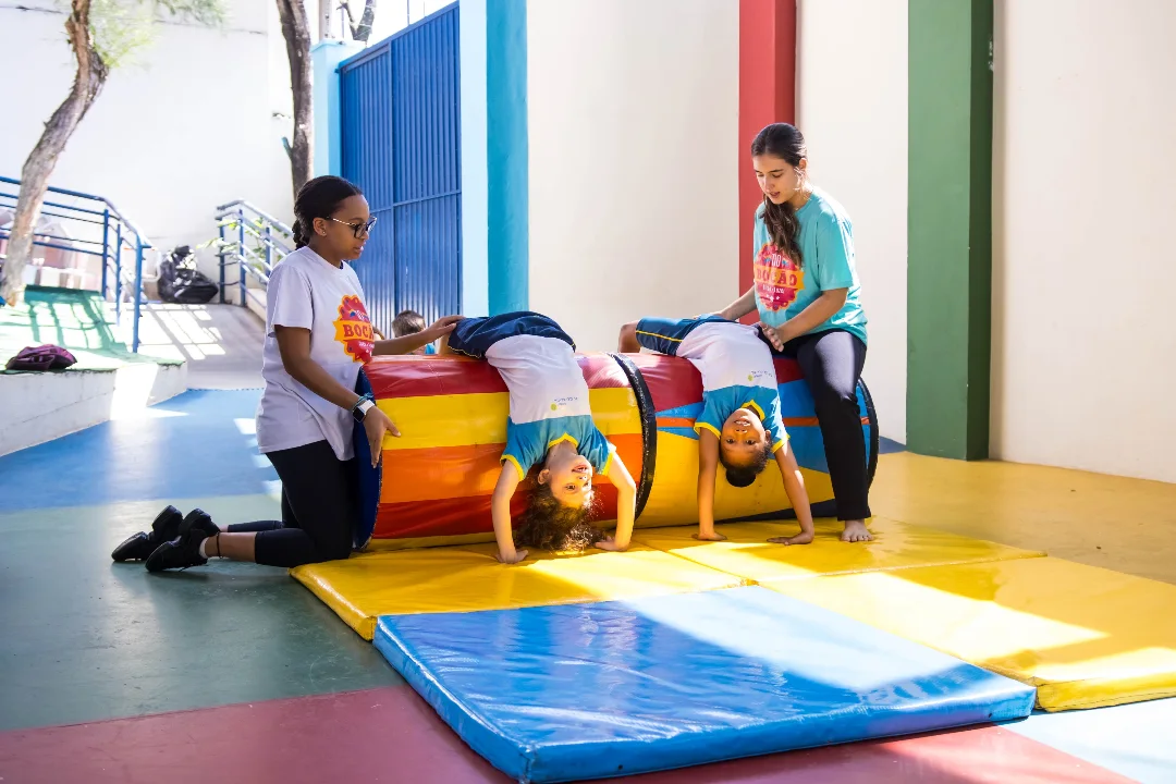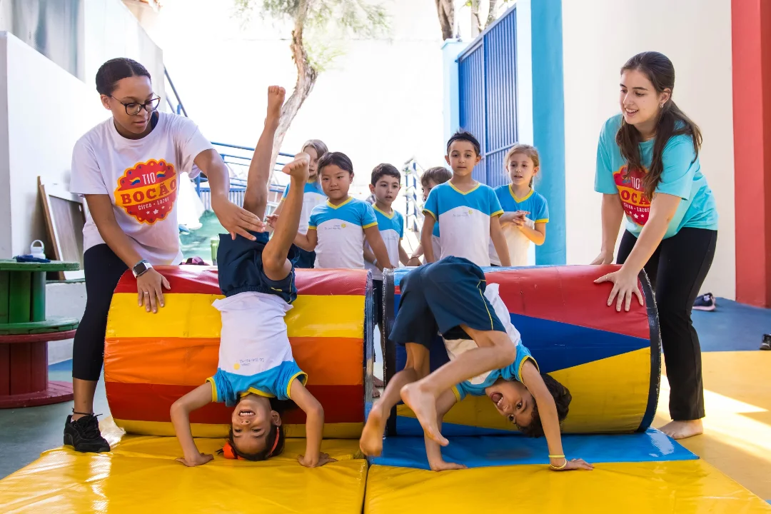 Teve equilíbrio no carretel, treino de cambalhota de costas e muitas descobertas em movimento. Entre uma tentativa e outra, eles desenvolvem coordenação, equilíbrio e confiança.