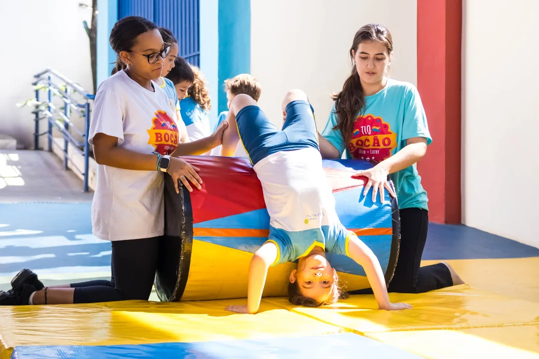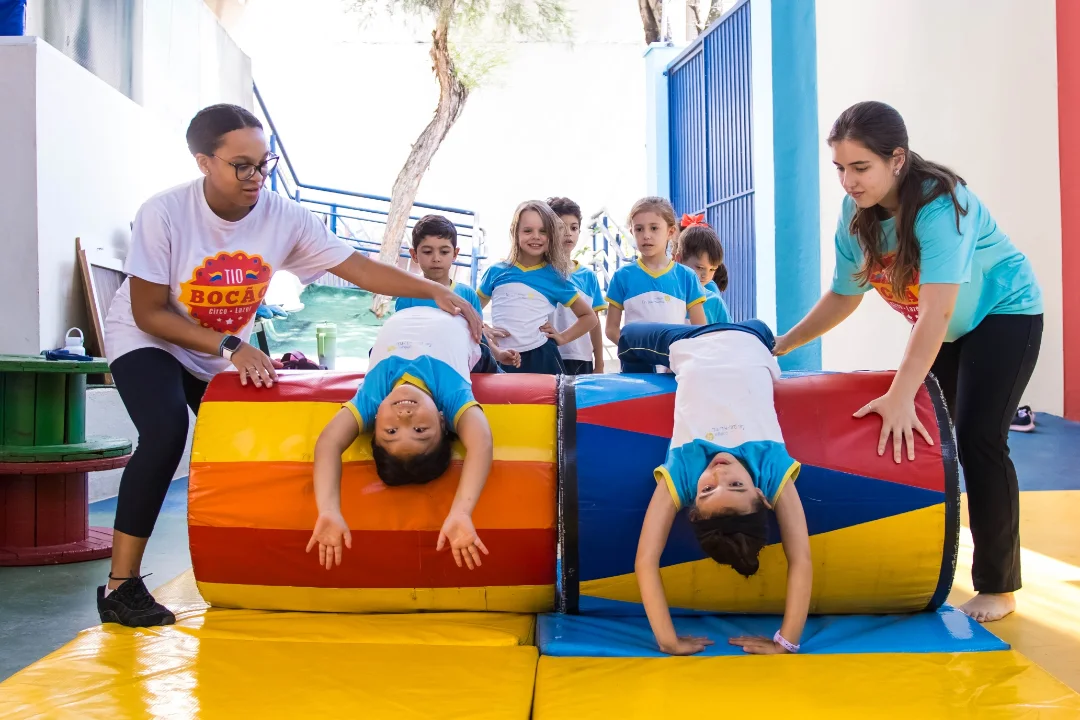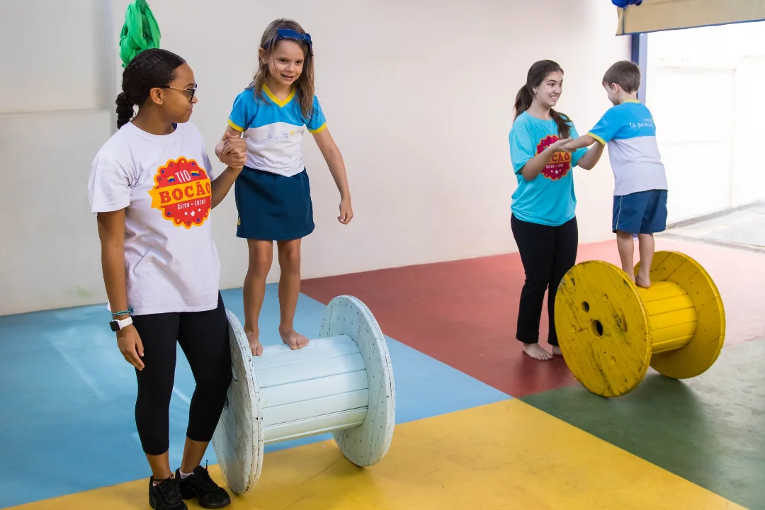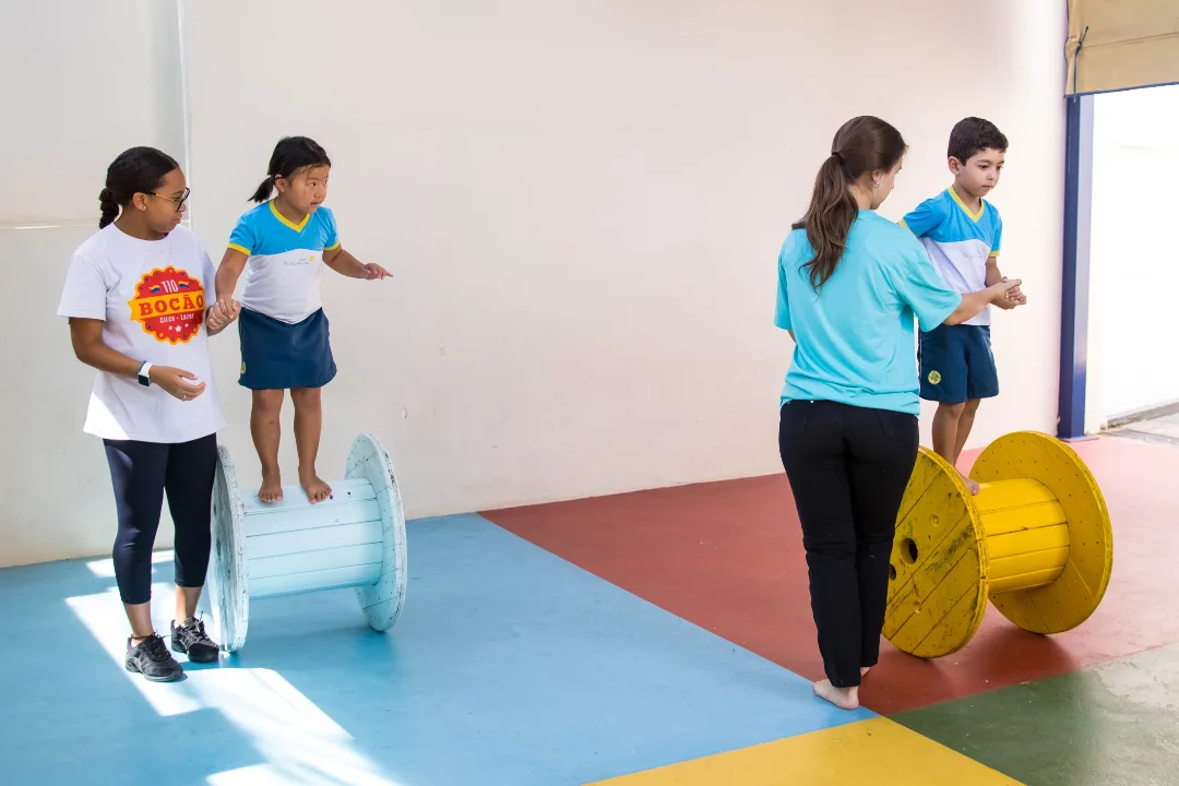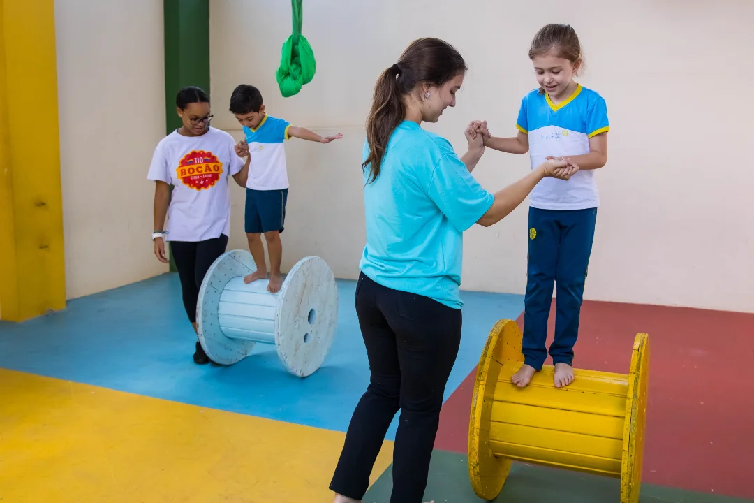 Teve equilíbrio no carretel, treino de cambalhota de costas e muitas descobertas em movimento. Entre uma tentativa e outra, eles desenvolvem coordenação, equilíbrio e confiança.