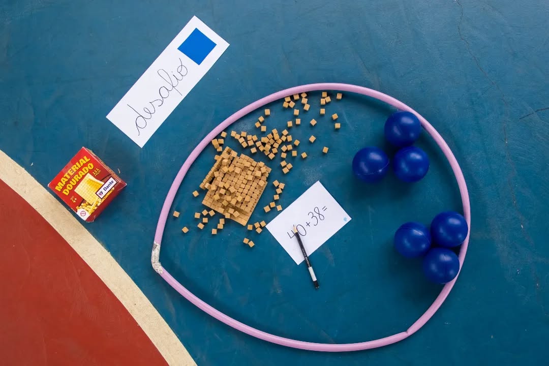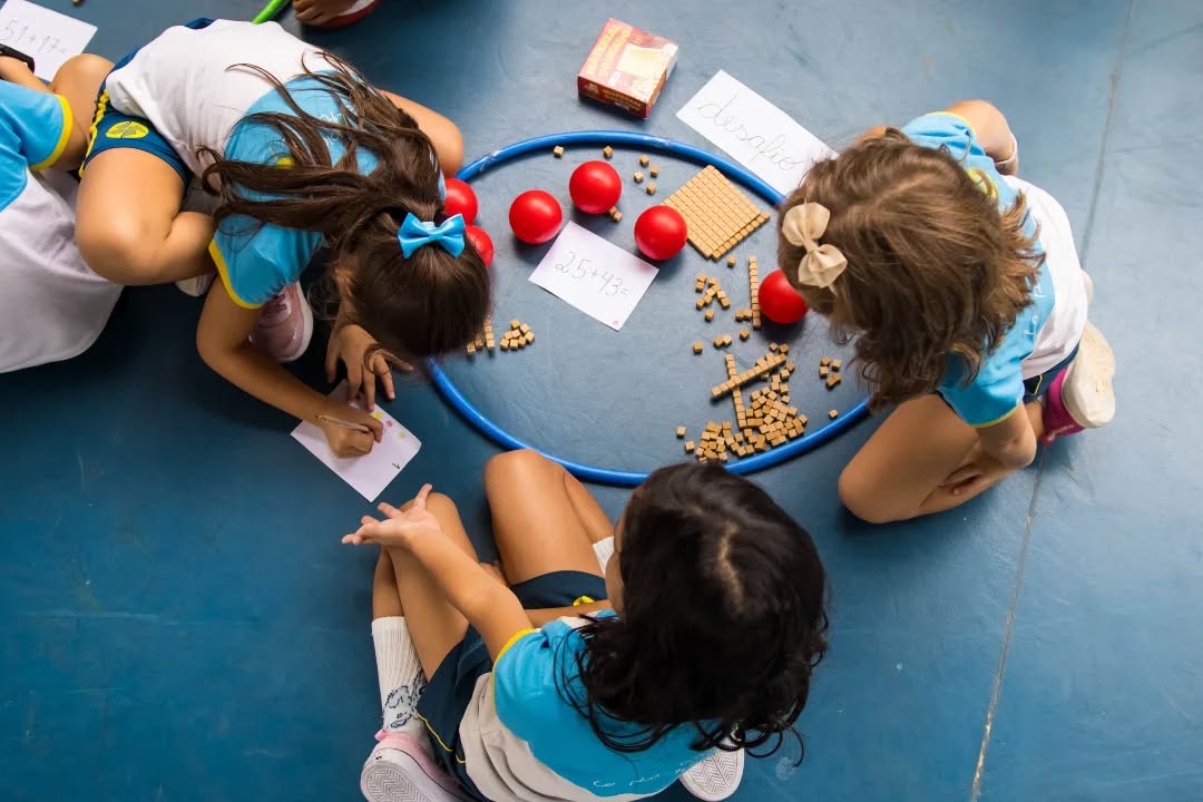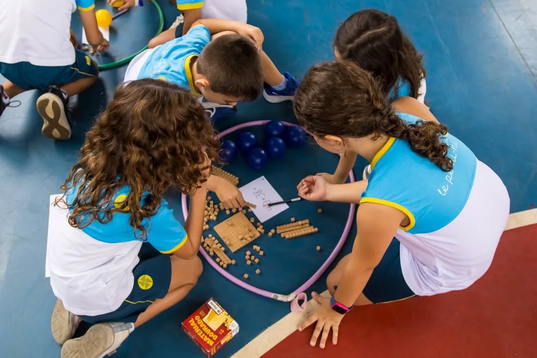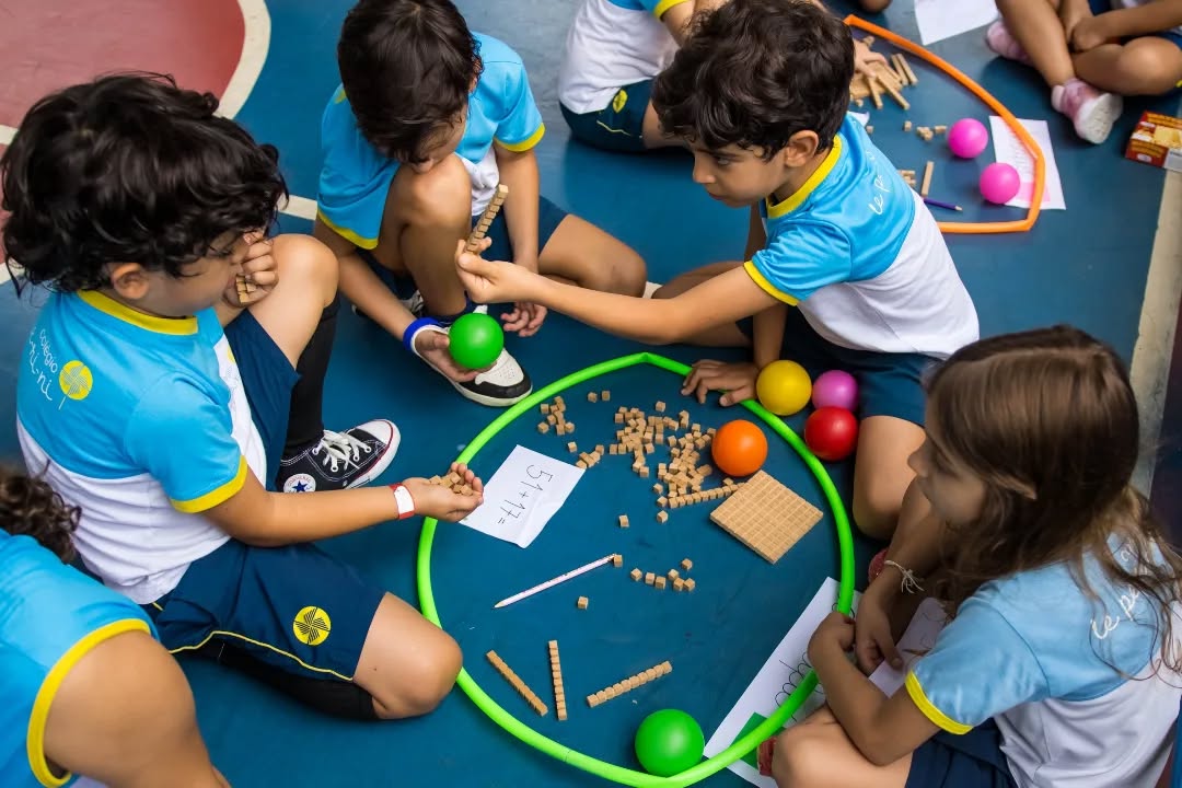 Organizados em equipes, resolveram diferentes situações de cálculo com o apoio do material dourado, recurso que possibilita a visualização e a compreensão do sistema de numeração. A cada desafio concluído, as equipes conquistavam pontos (bolinhas), tornando a atividade ainda mais motivadora.