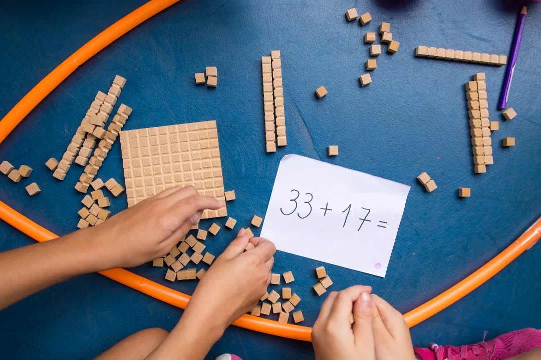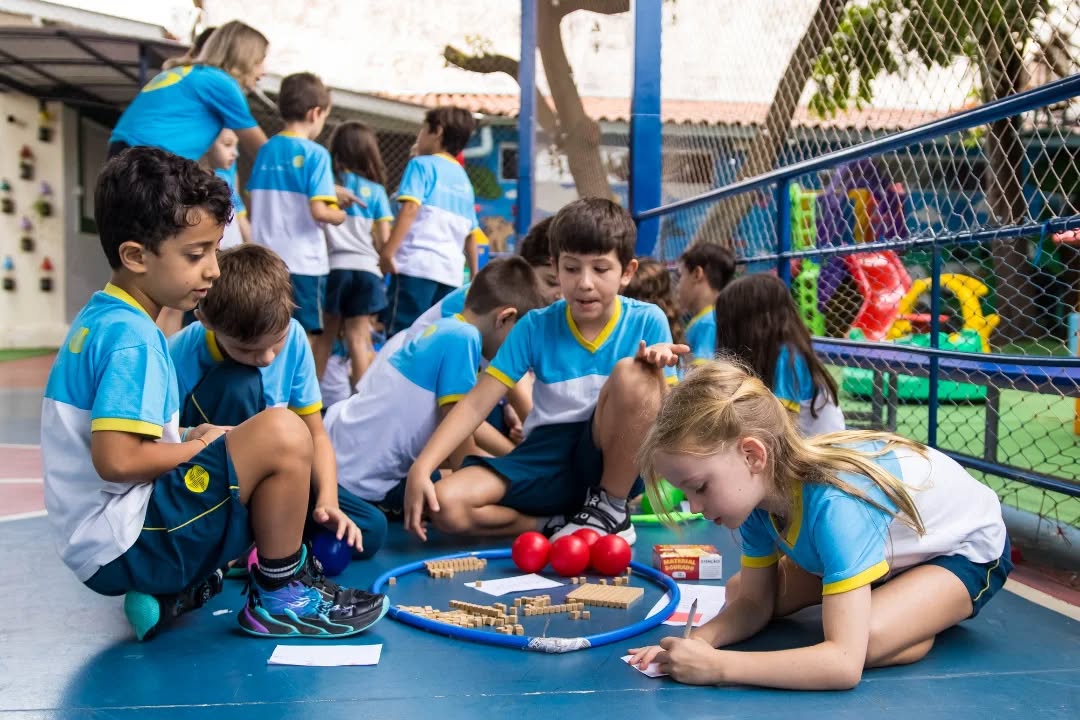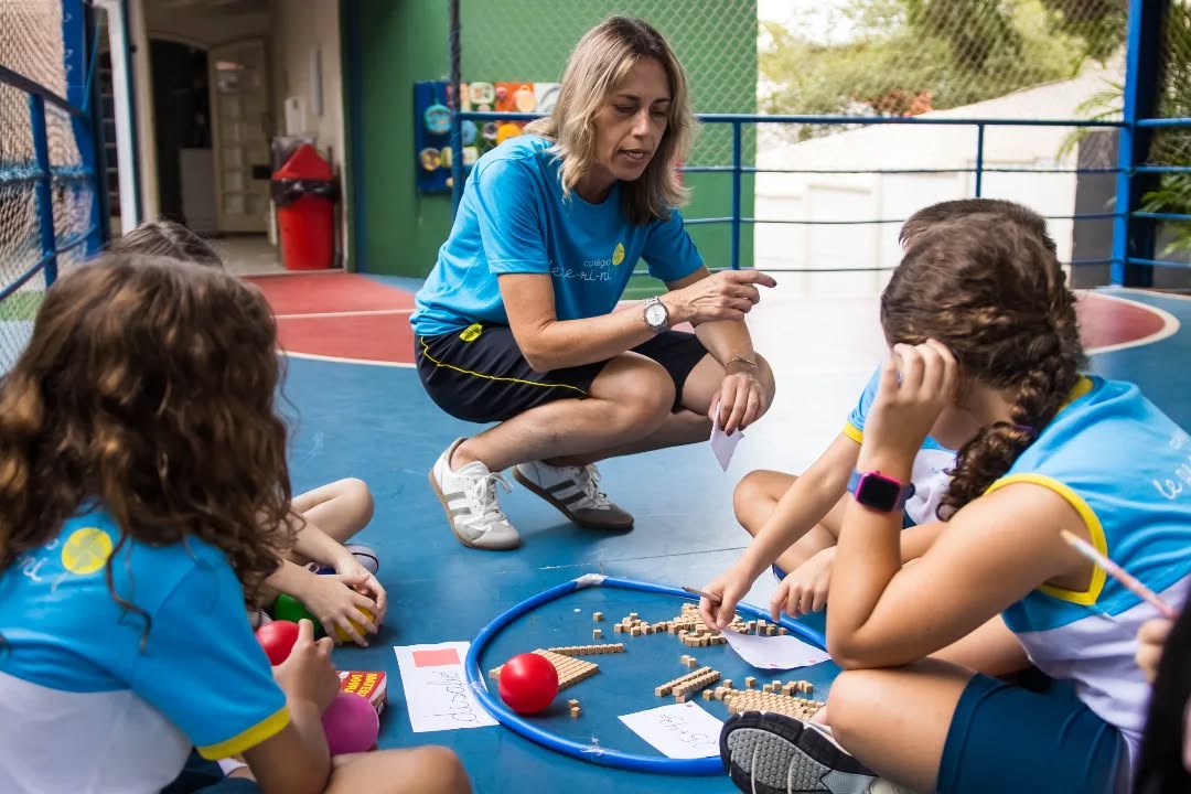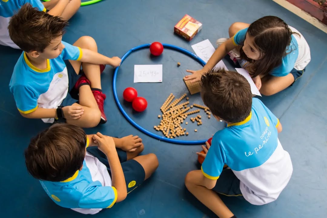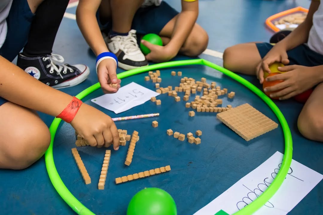 Organizados em equipes, resolveram diferentes situações de cálculo com o apoio do material dourado, recurso que possibilita a visualização e a compreensão do sistema de numeração. A cada desafio concluído, as equipes conquistavam pontos (bolinhas), tornando a atividade ainda mais motivadora.